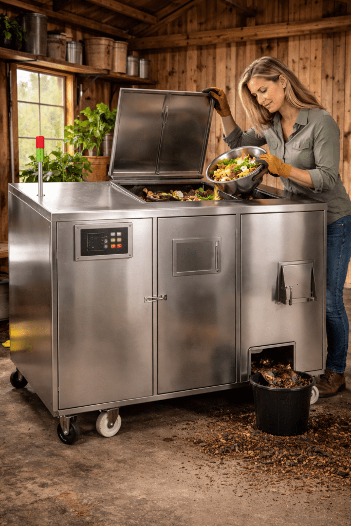 Automated mixing and aeration accelerate the composting cycle, reducing labor and time to finished material. Suited for higher waste volumes, small farms, homesteads, and shared community use.